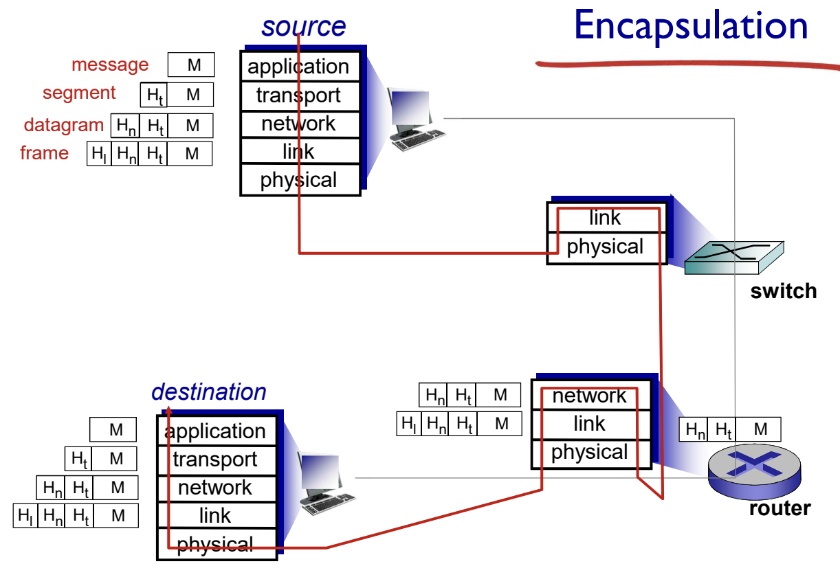 source에서의 각 계층이 encapsulation을 해서 보내면, destination에서의 각 계층에서 헤더를 떼는 decapsulation을 한다.